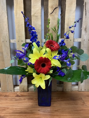 Arrangement with yellow lilies, red gerbera daisies, iris, blue delphinium, & mixed greenery