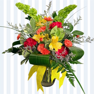 The designer's choice of vibrant and radiant colors. Flowers will not be as shown.